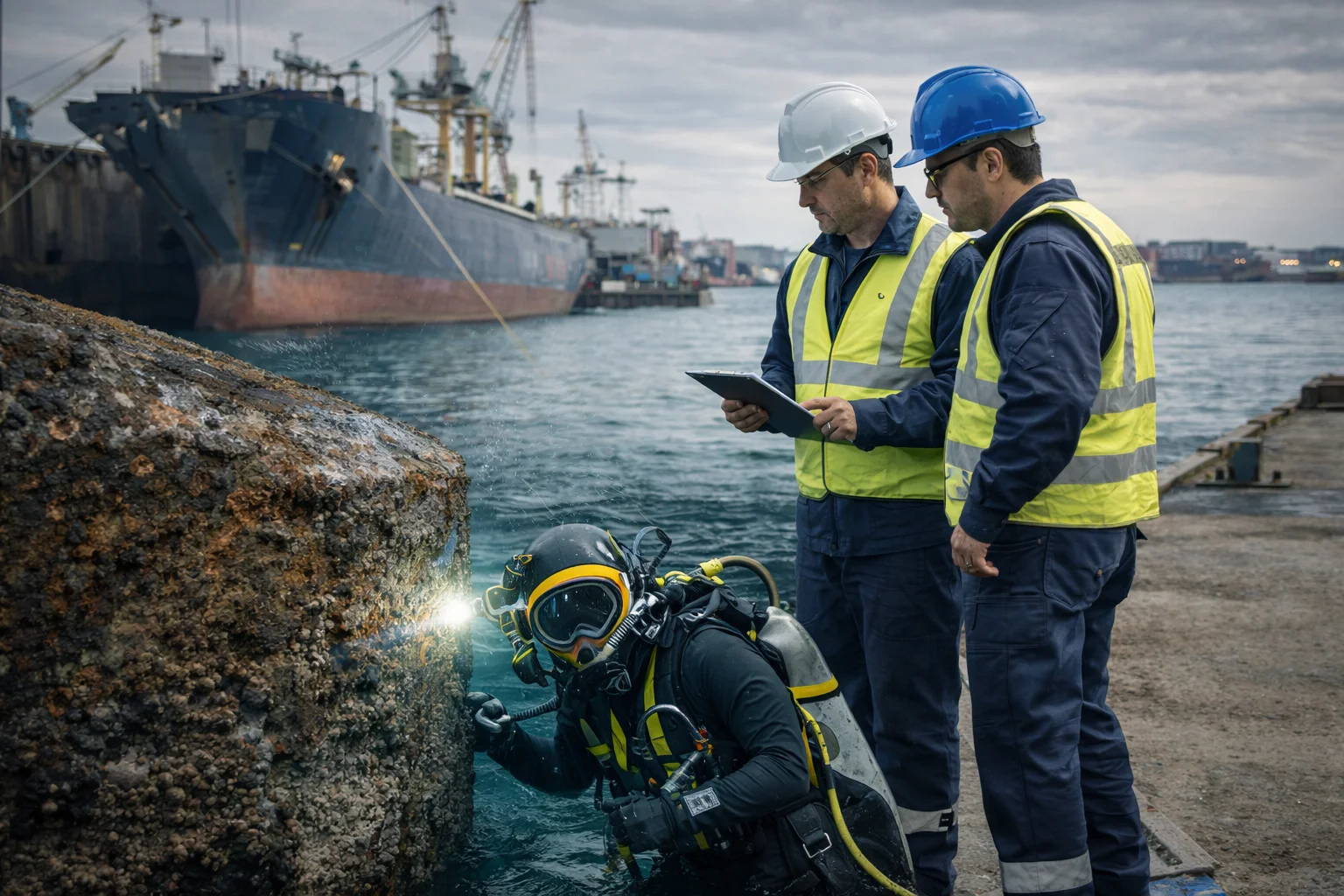 Realizamos levantamientos estructurales detallados e inspecciones (en muelle o submarinas) para detectar corrosión y daños críticos. Definimos soluciones técnicas precisas basadas en el estado real de sus activos.